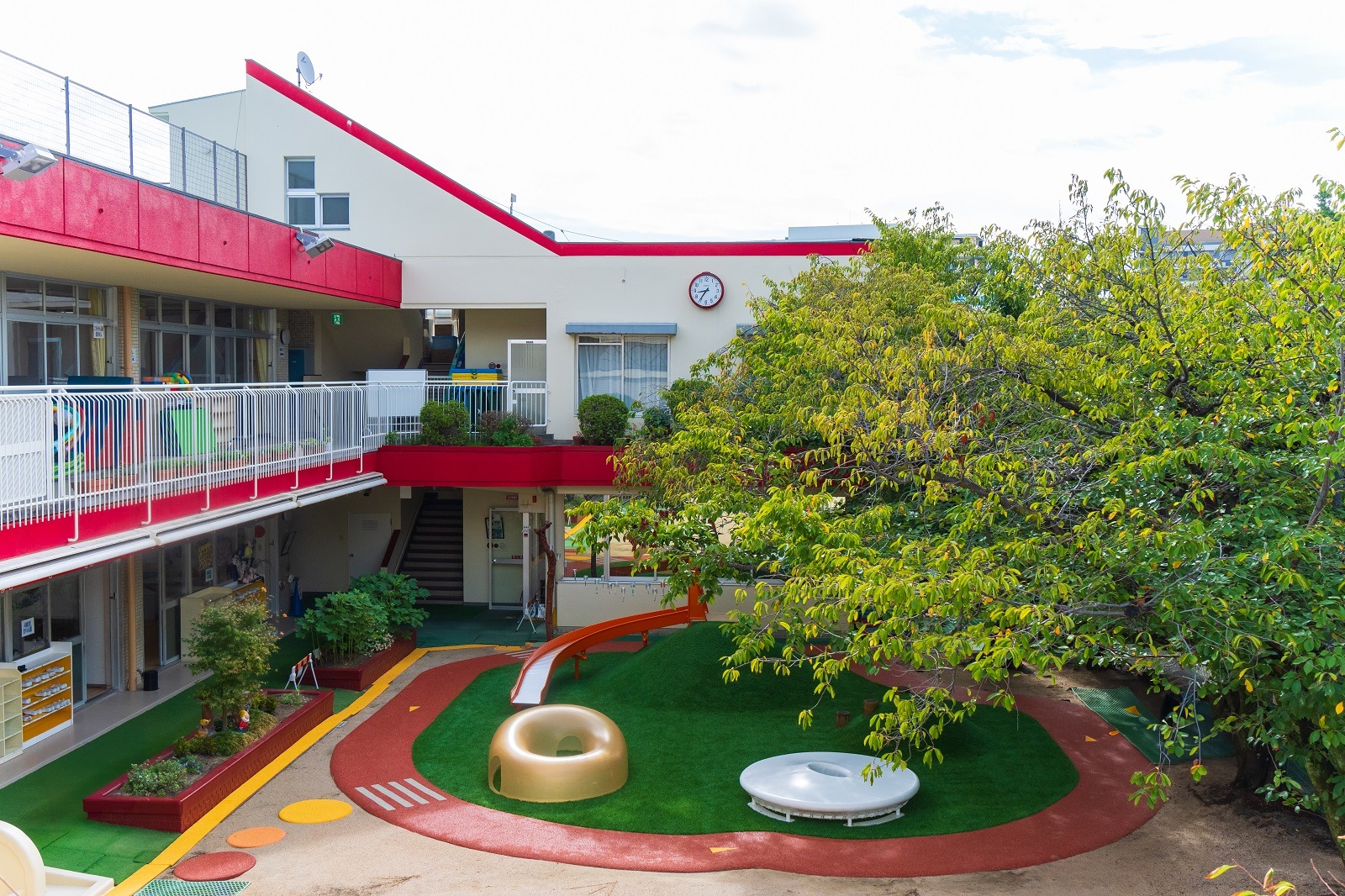 大きな桜の木が自慢の園庭。1階保育室と隣接しています。R7年8月園庭リニューアル。