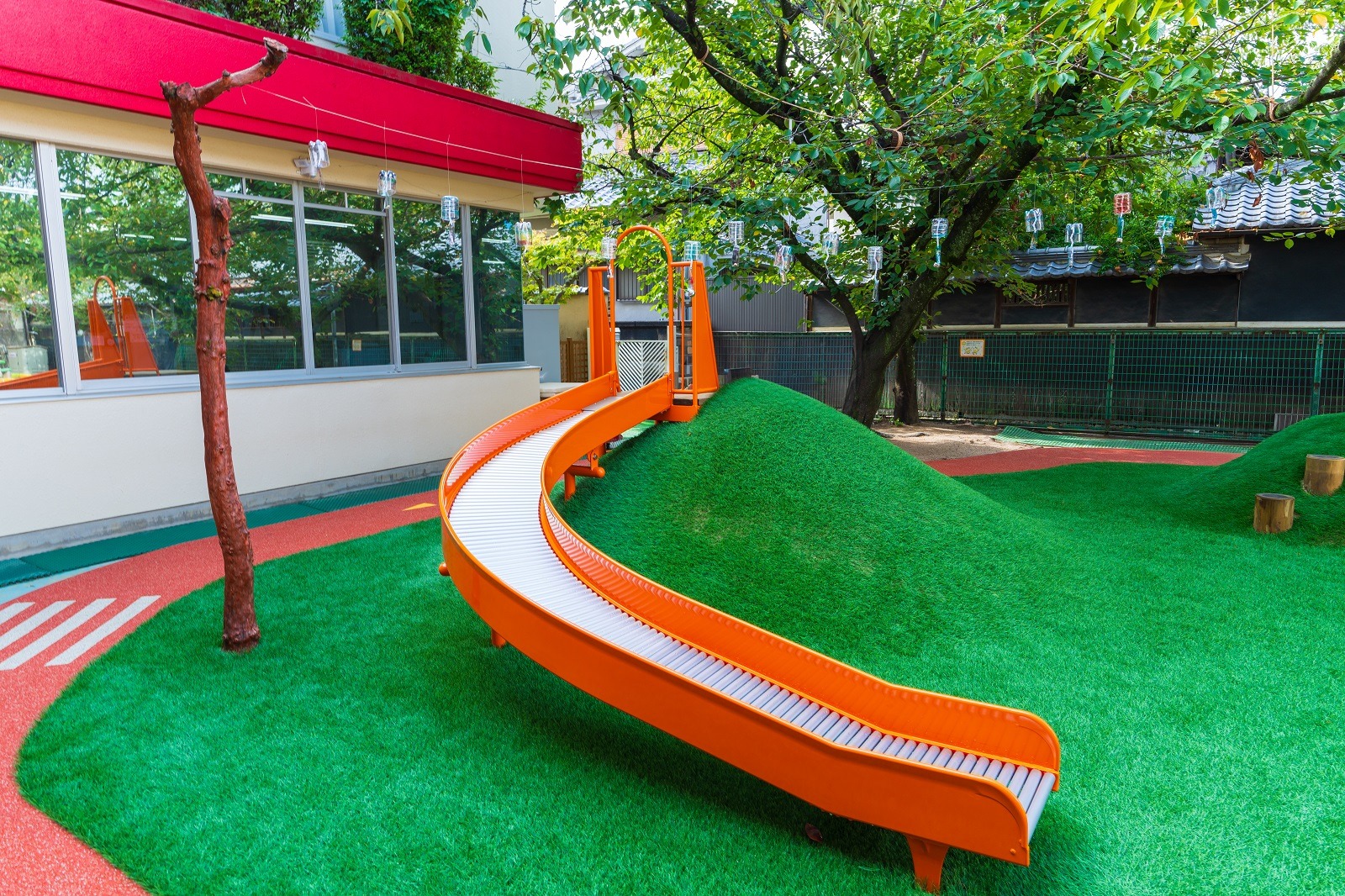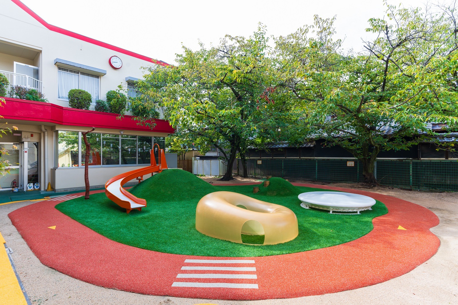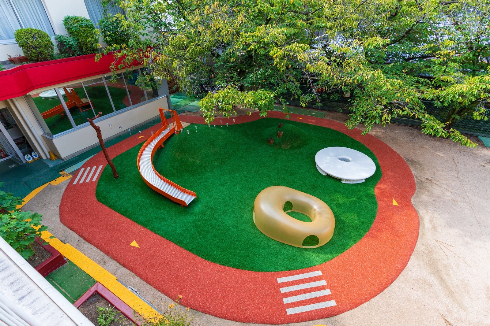 園庭の半分が人工芝。裸足でのびのびと遊べます。芝生の周りには三輪車の道路と歩行者の横断歩道をデザインしたゴムチップが敷かれています。